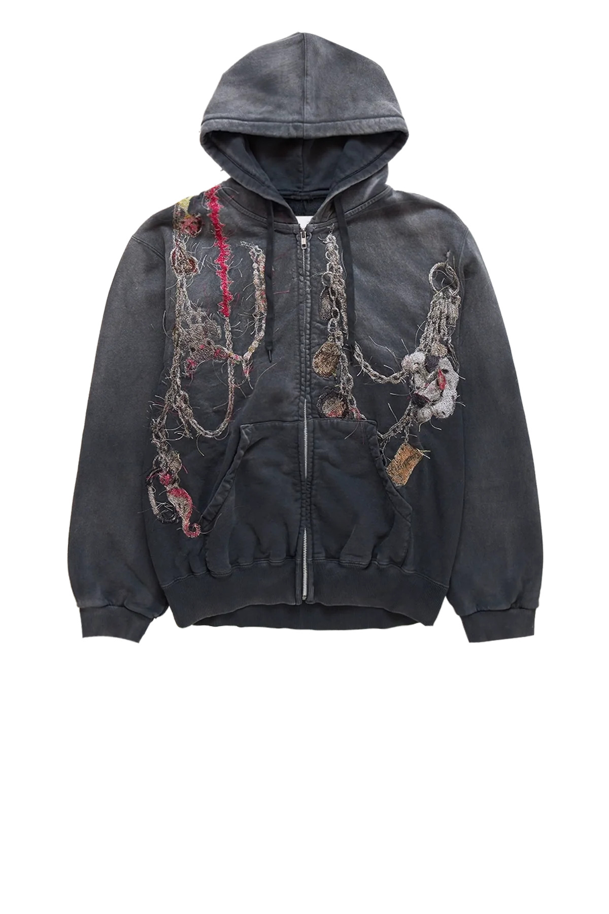 Doublet Embroidered Chain Zip-Up Hoodie featuring layered embroidered embellishments and frayed detailing. Designed with a hooded neckline, front zip fastening, and kangaroo pockets, it combines casual structure with statement detailing. DETAILS Frayed thread detailing Hooded neckline Front zip opening Kangaroo pockets Ribbed cuffs and hem Material: 100% Cotton Product codes: - SKU: ESSX/DBL/AW25/25AW43CS405/Black/L - UPC: 1403558058407