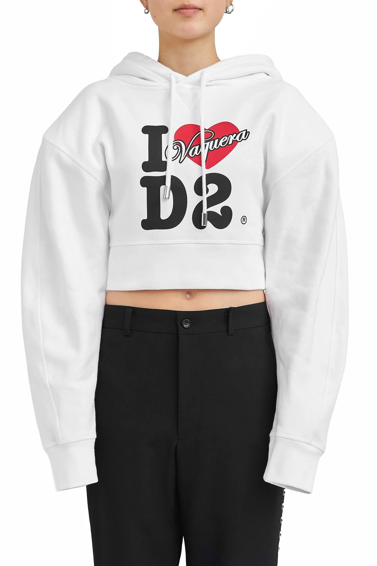 The Dsquared2 Vaquera Gimy Dean Hoodie in jersey featuring a cropped silhouette with padded structured shoulders, curved sleeves, a drawstring hood, dual logo print at the front, and rib-knit cuffs and hem. 15" long. Model is 5'9 and wears size medium From the Dsquared2 + Vaquera collaborative AW '25 collection DETAILS - Jersey fabrication - Cropped - Padded shoulders - Voluminous sleeves - Text print at front - Ribbed-knit cuffs + hem Sizing: - True to size Material: Cotton Made in Italy Product codes: - SKU: ESSX/DSQ/AW25/S72GU0501S25516100/White/XS - UPC: 8053601377233