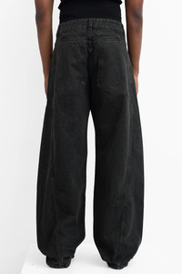 The Eckhaus Latta Bend Jeans in garment-dyed and stonewashed non-stretch denim with fading throughout, a mid-rise, four-pocket styling, and curved legs. Model is 5'10 and wears size 32 DETAILS - Garment-dyed + stonewashed - Non-stretch denim jeans - Fading throughout - Mid-rise - Belt loops - Four-pocket styling - Zip-fly - Curved legs Sizing: - True to size Material: 100% Cotton Made in United States Product codes: - SKU: ESSX/ECK/AW25/1225ELPF25S/Gray/28 - UPC: 111001372772