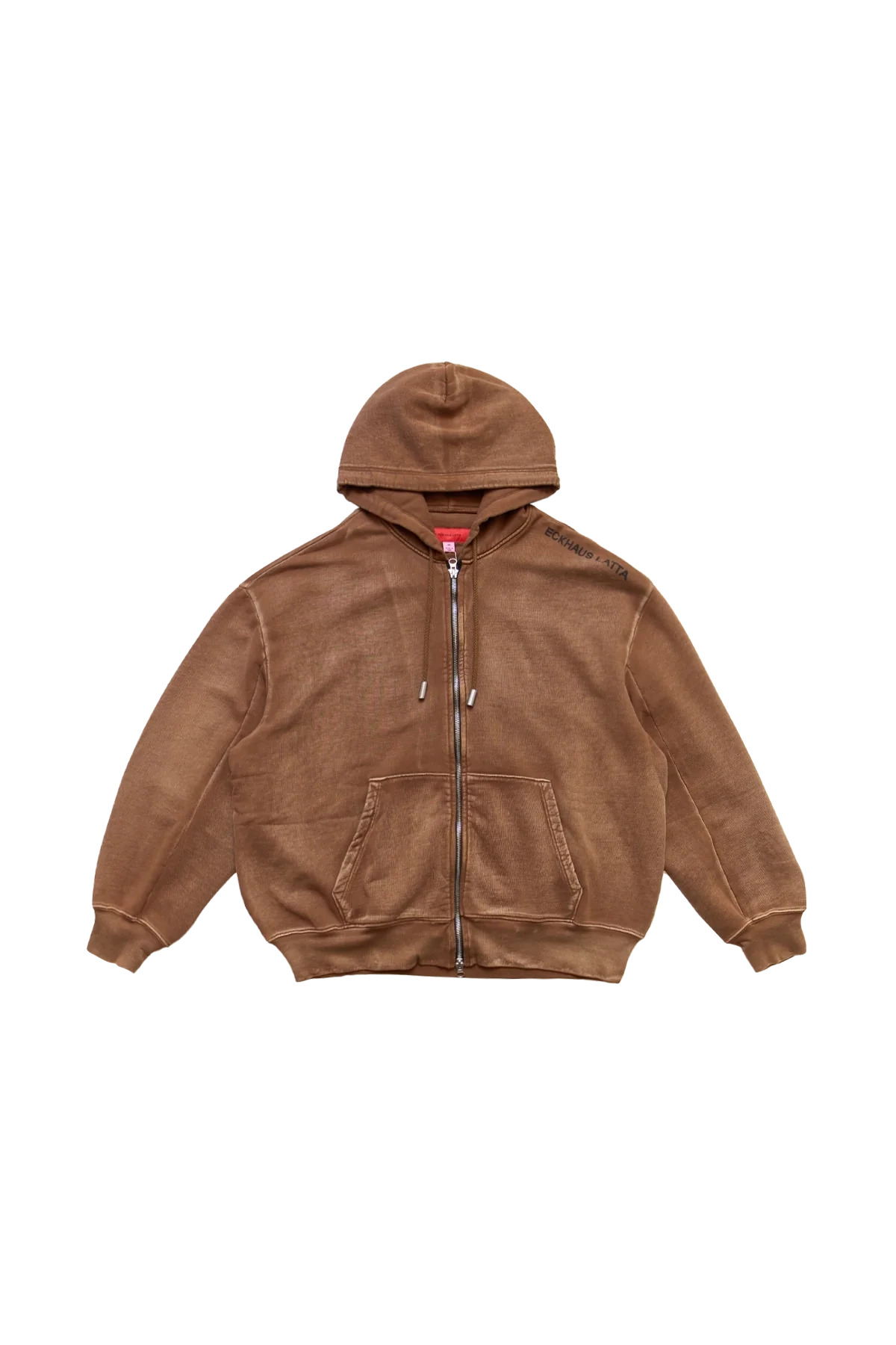 Eckhaus Latta Bison Zip Hoodie in garment-washed brushed French terry featuring dropped shoulders, fading throughout, drawstring at hood, two-way zip closure, patch pockets, and logo print at shoulder. DETAILS - Garment-washed - Brushed French terry - Fading throughout - Drawstring at hood - Two-way zip closure - Patch pockets - Logo print at shoulder Sizing: - True to size Material: Cotton. Made in Peru Product codes: - SKU: ESSX/ECK/SS25/1103ELPS25B/brown/XS - UPC: 111001355928