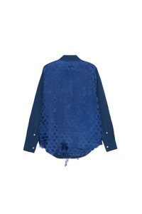 The Edward Cuming Classic Lung Window Shirt in seersucker featuring paneled construction with frayed edges throughout, and a contrasting graphic back panel. DETAILS - Seersucker fabrication - Paneled construction - Frayed edges throughout - Spread collar - Button-front closure - Long sleeves - Single-button barrel cuffs Sizing: - True to size Material: Cotton Made in Spain Product codes: - SKU: ESSX/EDA/SS25/SS25S45/Blue/46 - UPC: 1403558040761
