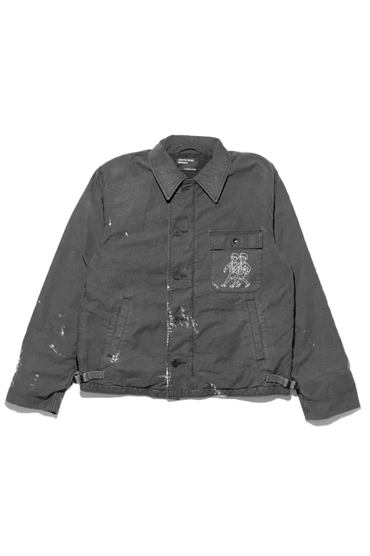 ERD Study For (A Portrait) N35 Jacket features a button front with welt pockets at the waist and a chest flap pocket with button closure. Distinctive printed artwork adorns the back and front pocket, while the signature vintage wash and heavy distressing create authentic character. DETAILS 100% Cotton Made in Japan