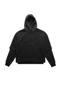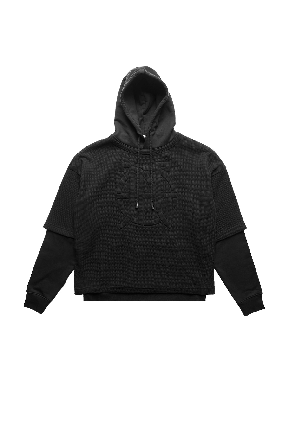 Jean Paul Gaultier oversized hoodie featuring double layered construction with contrasting jersey sleeves, a waffled overlayer with striking logo embossed at chest, drawstring hood, knit cuffs, and signature locker loop at back collar. DETAILS - Layered Construction - Adjsutable Drawstring Hood - Logo Embossed at Chest - Ribbed-Knit Cuffs - Signature Locker Loop at Back Material: 100% Cotton Made in Portugal Product codes: - SKU: ESSX/JPG/PRESS25/2533FSW050EJ07600/black/S - UPC: 3666259901016