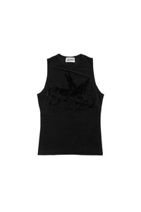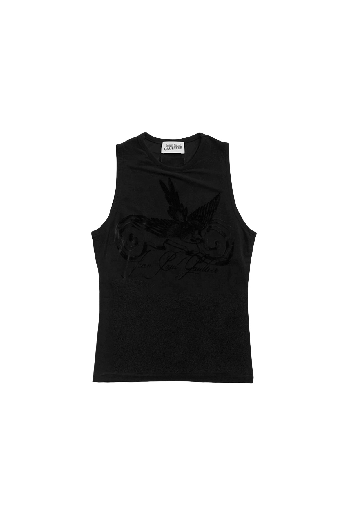 The Jean Paul Gaultier Flocked "The Tattoo" Ruban Tank Top in stretch mesh featuring a slim-fit, crewneck, logo graphic flocked at the chest, signature locker loop at the back collar, and "Paris" script flocked across the back. Partially lined. This item is final sale and is not eligible for return or exchange. DETAILS - Unisex - Lightweight jersey mesh - Smooth, soft handfeel - Slim-fit with stretch - Crewneck - Logo graphic flocked at chest - Locker loop at back - Text flocked at back Sizing: - True to size Material: 94% Viscose / 6% Elastane Made in Portugal Product codes: - SKU: ESSX/JPG/SS25/2534FDB055IJ08200/Black/S - UPC: 3666259883923