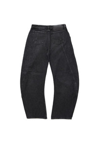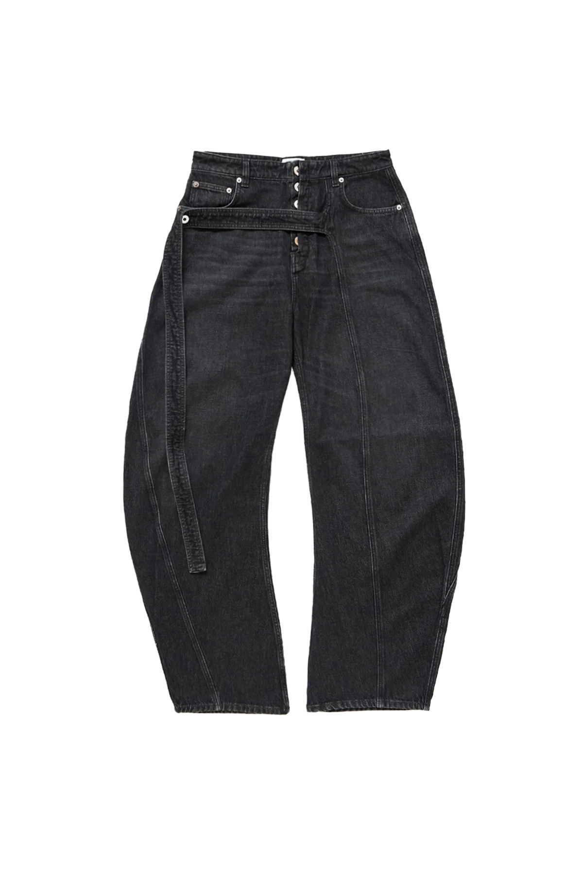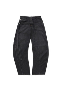 The Jean Paul Gaultier Low Waist Strap Detail Jean featuring five-pocket paneled constructon with a curved wide-leg, semi-exposed silvertone button closure, a decorative long strap running across the front for alternate styling, and signature tonal leather logo patch and locker loop at the back waistband. Model is 5'10 and wears size 32 DETAILS - Non-stretch faded denim - Paneled construction - Five-pocket styling - Low-rise - Wide curved legs - Strap across front - Logo-engraved silvertone hardware - Logo patch at back - Locker loop at back Sizing: - True to size Material: Cotton Made in Italy Product codes: - SKU: ESSX/JPG/AW25/2503WTR022D01606/Black/26 - UPC: 3666259860825