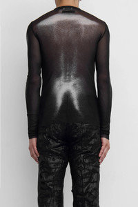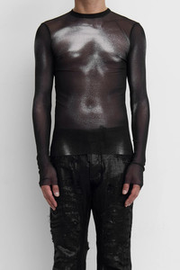 The Jean Paul Gaultier Mesh 'Body Dust' Print Top in a signature lightweight sheer stretch fabrication featuring a slim-fit, crewneck, contrast print, and locker loop at the back neckline. Unlined. Model is 5'10 and wears size medium DETAILS - Unisex - Lightweight - Stretch fabrication - Sheer - Slim-fit - Crewneck - Long sleeves - Locker loop at back Sizing: - True to size Material: Polyamide Made in Italy Product codes: - SKU: ESSX/JPG/AW25/2504WTO366M010P0091/Black/XS - UPC: 3666259841060