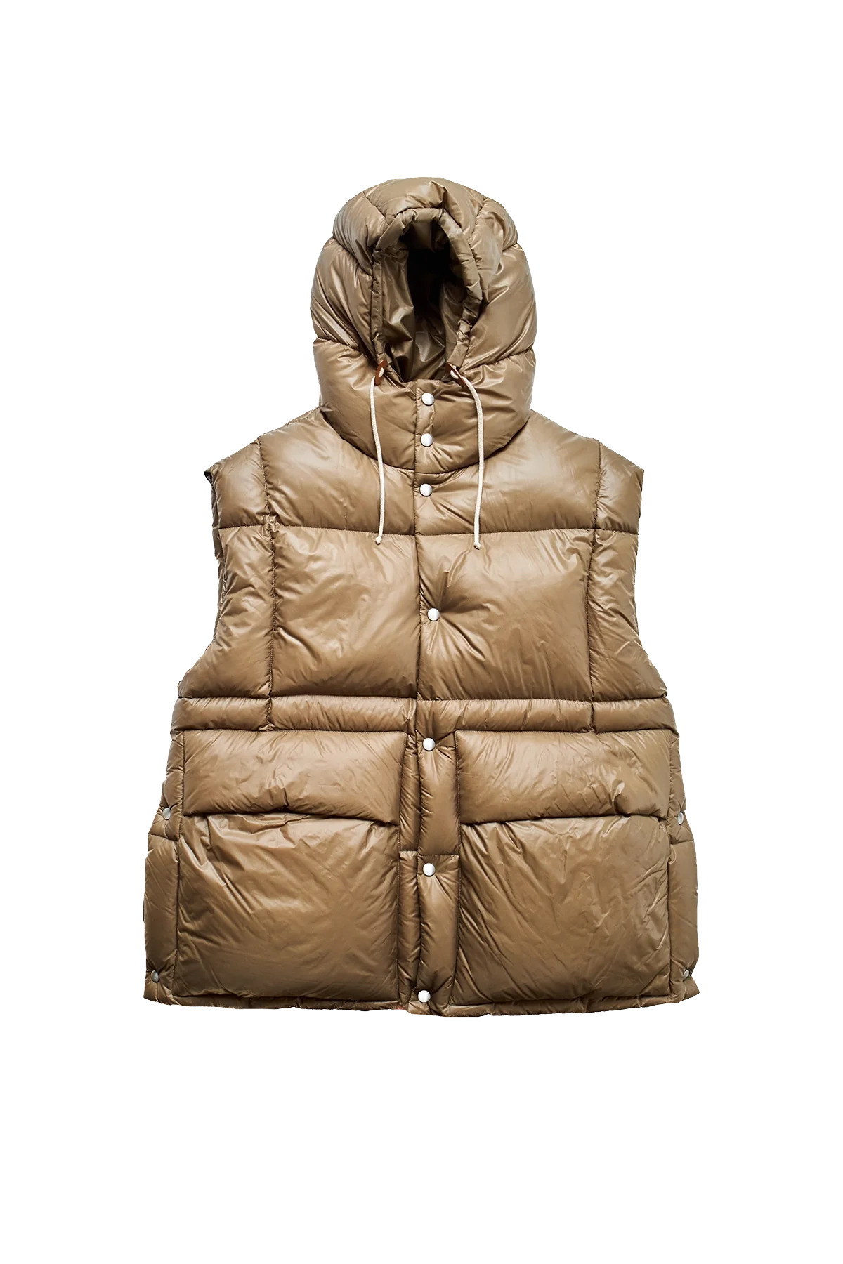 The Jil Sander+ Lightweight Recycled Nylon Down Vest in quilted taffeta featuring an oversized silhouette, drawstring at hood, press-stud closure, flap pockets, press-stud vent at side seams, logo patch at back hem, welt pocket at interior, and nylon satin lining. DETAILS - Lightweight - Down-filled - Recycled nylon taffeta - Quilted - Drawstring at hood - Press-stud closure - Flap pockets - Press-stud vent at side seams - Logo patch at back hem - Welt pocket at interior - Nylon satin lining Sizing: - True to size Material: 100% Recycled Goose Down Body: 100% Recycled Nylon Made in Italy Product codes: - SKU: ESSX/JIL/J47AF0143J70007218/BRWN/S - UPC: 2100001935405