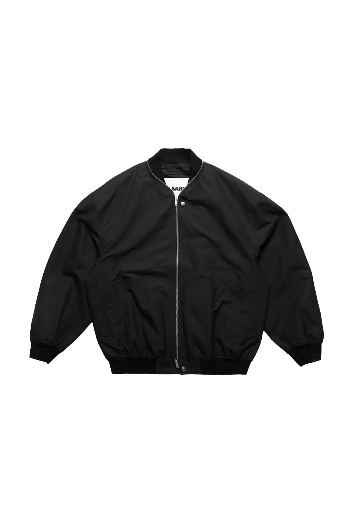 Jil Sander updated bomber featuring contrasting zip details with a ribbed knit stand collar, two-way zip closure, dropped shoulders, side pockets, and ribbed knit hem and cuffs. DETAILS - Slightly Padded - Stand Collar - Two-Way Front Zip - Contrasting Silver Tone Closures - Contrasting Zip Detailing at Neckline - Side Pockets Sizing: - True to size Material: 100% Wool Lining: 100% Cotton Trim: 89% Virgin Wool 9% Polyamide 2% Elastane Made in Italy Product codes: - SKU: ESSX/JIL/SS25/J23SW0006J45225001/black/52 - UPC: 8050393978822