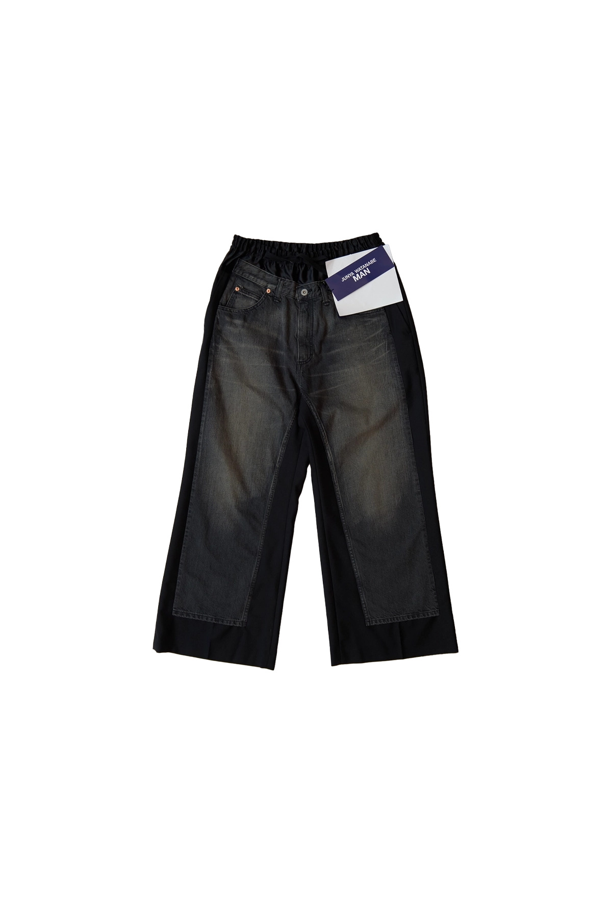 The Junya Watanabe Man Wool Trousers With Denim Panel are hybrid pants with a jean-inspired facade in faded and whiskered denim with a relaxed fit, and five-pocket styling. DETAILS - Hybrid construction - Relaxed silhouette - Faded denim front - Five-pocket styling - Elasticated drawstring waistband Sizing: - True to size Material: Wool Body Cotton Panels Made in Japan Product codes: - SKU: ESSX/JUN/SS25/WOP0260511/Black/XS - UPC: 3607936305222