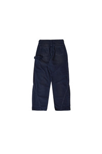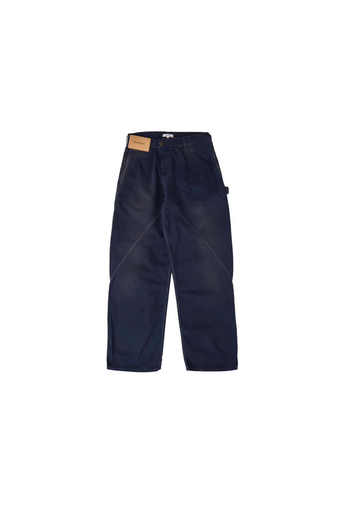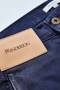 The JW ANDERSON Aged Twisted Workwear Jeans are wide-leg garment-washed non-stretch asymmetrical relaxed-fit low-rise jeans with fading and whiskering throughout, three pockets, hammer loop, logo-engraved hardware, embroidered front logo, and leather logo patch at front. DETAILS - Garment-washed - Wide-leg - Non-stretch denim - Asymmetrical styling - Relaxed-fit - Low-rise - Fading and whiskering throughout - Three pockets - Hammer loop - Logo-engraved hardware - Embroidered front logo - Leather logo patch at front Sizing: - True to size Material: Cotton Made in Italy Product codes: - SKU: ESSX/JWA/SS25/DT0115PG1522888/Blue/28 - UPC: 5057543604672
