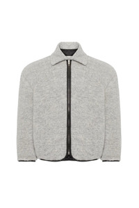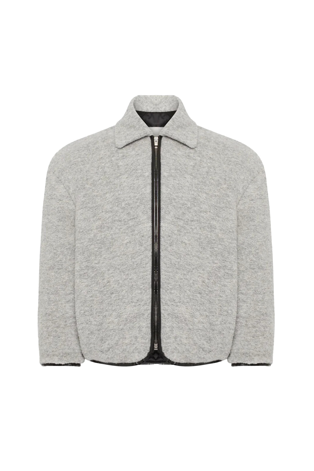 The JW Anderson Contrast Trim Casual Jacket in virgin wool and graphic boucle melange featuring leather-effect piping, dropped shoulders, a front zip closure, side pockets, signature leather panel with embossed logo on the back, and quilted lining. DETAILS - Lightweight - Lightly padded - Boucle melange fabrication - Quilted lining - Leather-effect piping - Dropped shoulders - Front zip closure - Side pockets - Leather logo tag on back Sizing: - True to size Material: 50% Virgin Wool / 33% Cotton / 17% Polyester Made in Bulgaria Product codes: - SKU: ESSX/JWA/AW25/JK0394PG1820905/Gray/S - UPC: 5057543620740