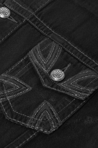 blends classic denim trucker structure with bold graphic artistry. Cut from rigid denim in a stone-washed indigo finish, it’s detailed with laser-cut leather appliques around pocket edges, thick saddle-stitching, 4x4 cross embroidery, and T-box branding. DETAILS Oversized fit Rigid indigo denim construction Button-front closure Laser-cut leather appliques at pocket edges Thick-gauge saddle stitching 4×4 cross embroidery Ksubi T-box branding No stretch Care: Machine wash cool inside-out, do not bleach/tumble dry, color may transfer Material: 100% Cotton Product codes: - SKU: ESSX/KSU/AW25/MAH25JK001/Black/L - UPC: 9358214383497