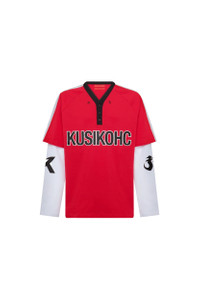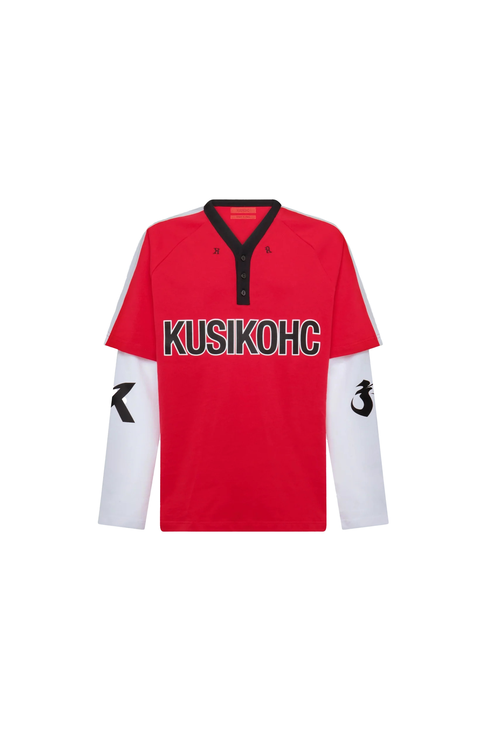 The Kusikohc Baseball Long Sleeve Polo in jersey featuring a layered raglan sleeve effect, a v-neck with contrasting trim, logo embroidered at the front, and logo printed at the chest, sleeves, and back. DETAILS - Jersey fabrication - V-neck - Three-button placket - Logo embroidered at front - Logo printed throughout - Layered raglan sleeves Sizing: - True to size Material: Cotton Made in China Product codes: - SKU: ESSX/KUS/SS25/KUC2BP01KRMS001014/Red/S - UPC: 7000000029707