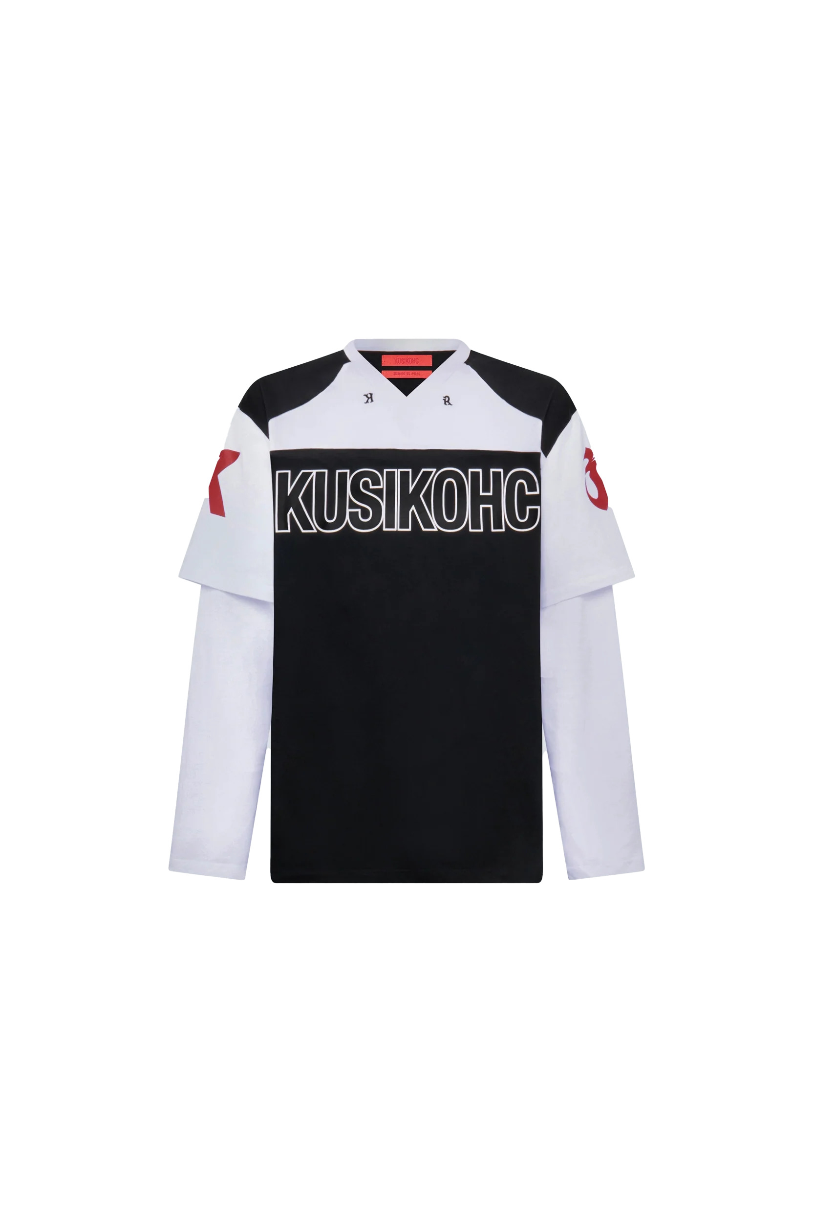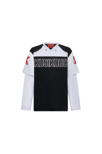 The Kusikohc Baseball Long Sleeve Tee in jersey with contrasting construction, dropped shoulders, logo embroidered at the front, and logo printed at the chest, back, and layered sleeves. DETAILS - Jersey fabrication - Contrasting construction - Dropped shoulders - Rib-knit V-neck - Logo embroidered at front - Logo printed throughout - Layered sleeves Sizing: - True to size Material: Cotton Made in China Product codes: - SKU: ESSX/KUS/SS25/KUC2BL03KRMS001999/Black/L - UPC: 7000000029691