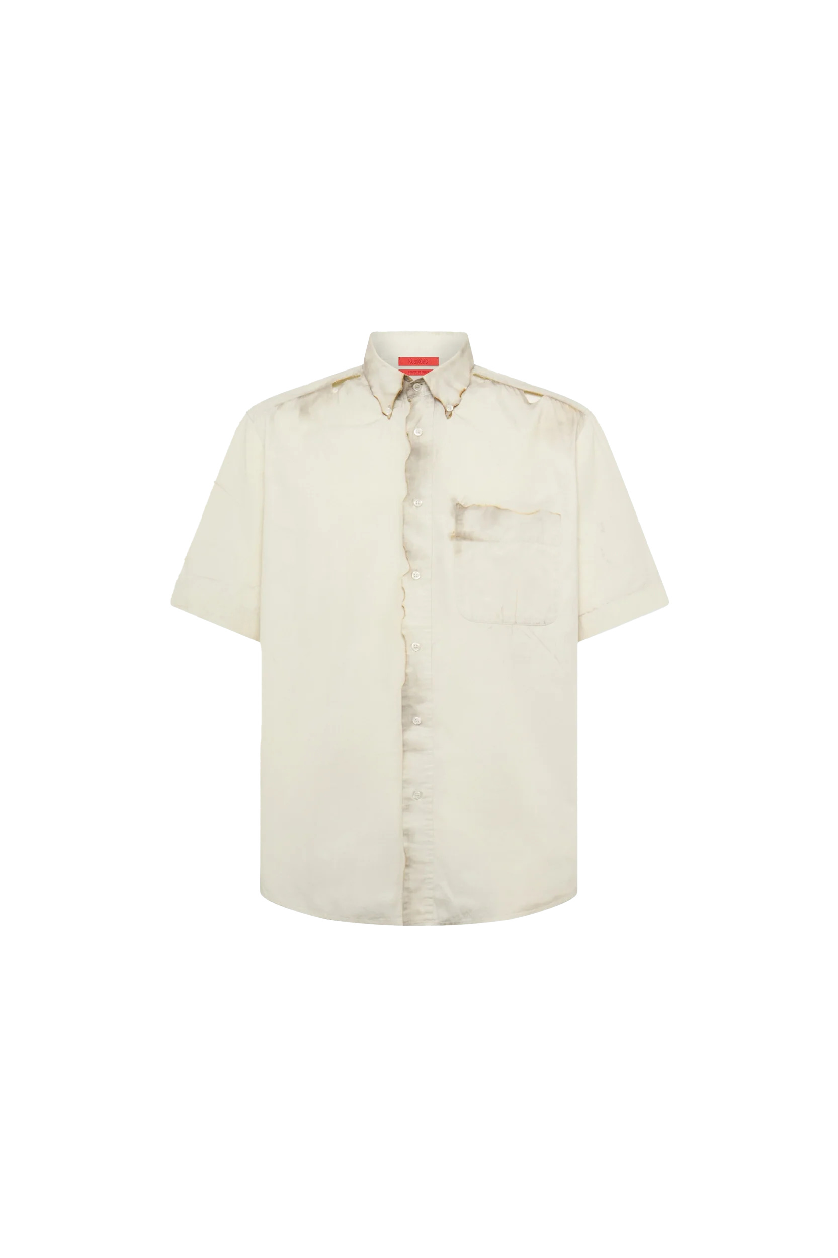 The Kusikohc Burned Shirt in poplin featuring distressing and discoloration throughout, a patch pocket at the chest, and shirttail hem. DETAILS - Poplin fabrication - Distressed + discolored - Spread collar - Button closure - Patch pocket at chest - Shirttail hem - Pleats at back yoke Sizing: - True to size Material: Cotton Made in China Product codes: - SKU: ESSX/KUS/SS25/KUS5ST853CNSH768001/White/S - UPC: 7000000032844