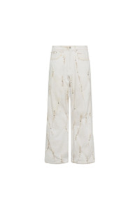 The Kusikohc Multi-Rivet Burnt Pants in non-stretch twill denim with a straight-leg, riveted darts creating a gathered, pleated effect with smudging throughout, four-pocket styling, and logo patch at the back waistband. DETAILS - Non-stretch twill denim - Riveted darts + smudging - Straight-leg - Belt loops - Four-pocket styling - Zip fly - Pleats at front - Logo patch at back Sizing: - True to size Material: 100% Cotton Made in China Product codes: - SKU: ESSX/KUS/SS25/KUS5PT36431CNTR543001/White/M - UPC: 7000000032301