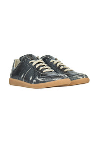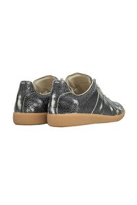 Maison Margiela Cracked Leather Replica Low Top Sneaker in treated calfskin featuring paneled construction with concealed elasticized gussets at vamp, logo patch at padded tongue, signature white logo stitching at heel tab, and treaded rubber sole. DETAILS - Grained calfskin - Low-top silhouette - Paneled construction - Lace-up closure - Concealed elasticized gussets at vamp - Logo patch at padded tongue - Padded collar - Signature white stitching at heel tab - Buffed calfskin + broadcloth lining - Textured rubber midsole - Treaded rubber sole Sizing: - True to size Material: Calfskin Sole: Rubber Made in Italy Product codes: - SKU: ESSX/MAS/AW25/S57WS0517P7424H8328/Black/39 - UPC: 8059039781390