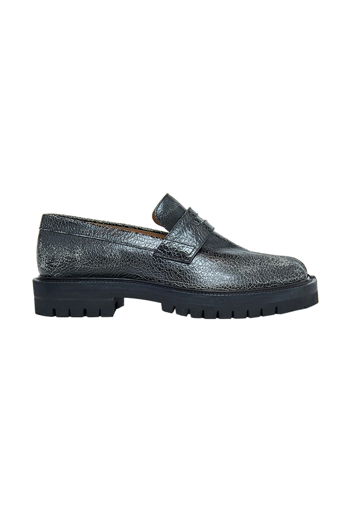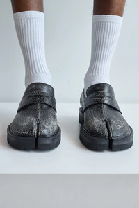 The Maison Margiela Cracked Leather Tabi County Loafer featuring a signature square cleft toe, strap with cutout at the vamp, white logo stitching at the heel collar, and treaded rubber sole. DETAILS - Cracked calfskin loafers - Square cleft toe - Strap with cutout at vamp - White stitching at heel collar - Buffed sheepskin lining - Serrated edge at welt - Treaded rubber sole Sizing: - True to size Material: Calfskin Sole: Rubber Made in Italy Product codes: - SKU: ESSX/MAS/AW25/S57WR0139P7424H8328/Black/39 - UPC: 8059039780089