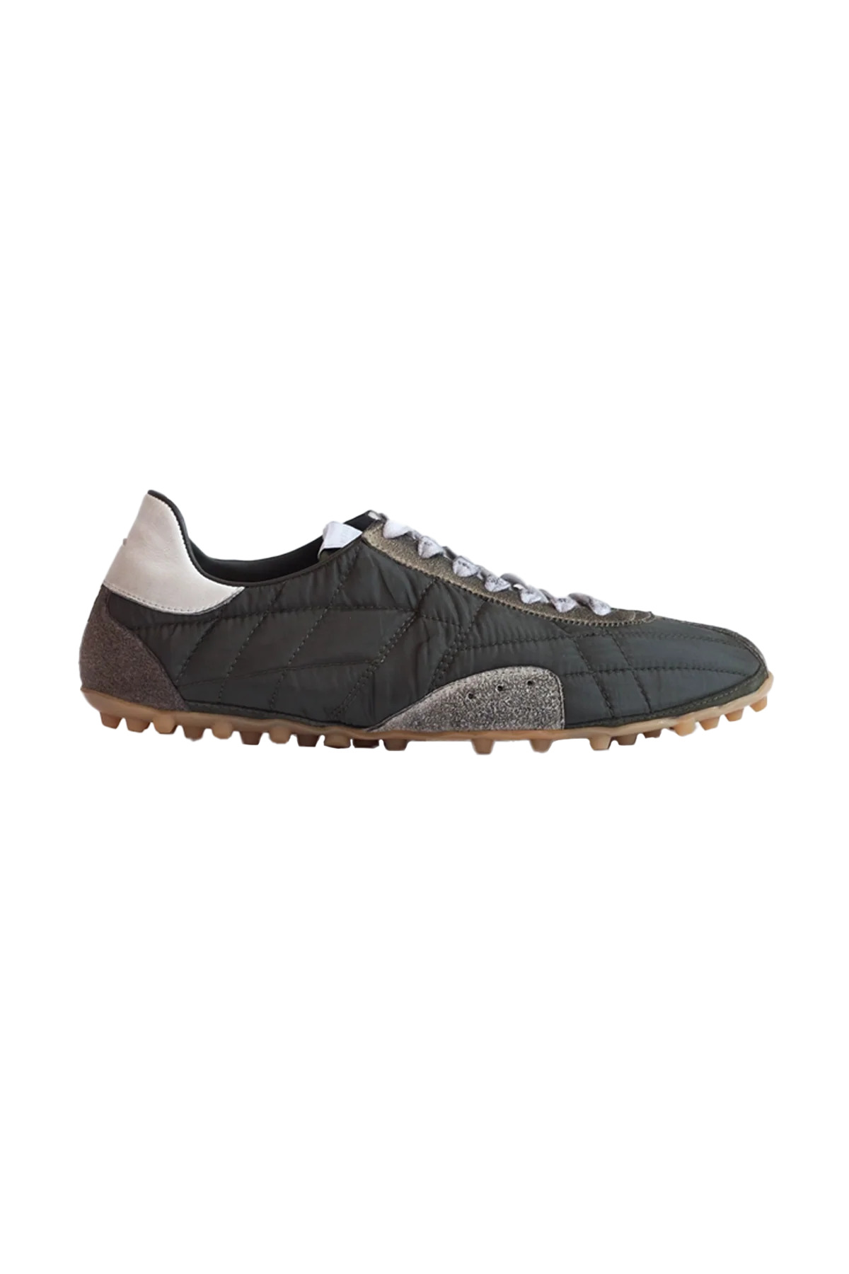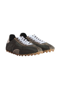 The Maison Margiela Sprinter Low Top Sneakers in lightewight quilted nylon and distressed suede featuring contrasting construction and signature white logo stitching at the back heel. DETAILS - Low-top silhouette - Quilted nylon body - Smudged suede paneling - Lace-up closure - Logo patch at padded tongue - Perforated detailing at outer side - White stitching at heel - Calfskin + mesh lining - Cleat-style rubber sole Sizing: - True to size Material: Nylon + Leather Sole: Rubber Made in Italy Product codes: - SKU: ESSX/MAS/AW25/S57WS0514P7415HB069/Green/40 - UPC: 8059039782670