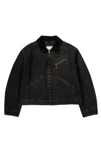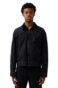 Maison Margiela Zip-up Denim Jacket features two welt pockets, a zipped chest pocket, and a ribbed collar with raw edge detailing. The iconic four stitches signature appears at the back, a subtle nod to the house's deconstructed aesthetic. Washed black finish adds depth and versatility. Fits true to size. DETAILS Zip-up closure Corduroy collar Slanted welt pockets Four stitch logo at back Material: 100% Cotton Made in Italy Product codes: - SKU: ESSX/MAS/PREAW25/S50AM0650M30040961/Black/48 - UPC: 8059039845986