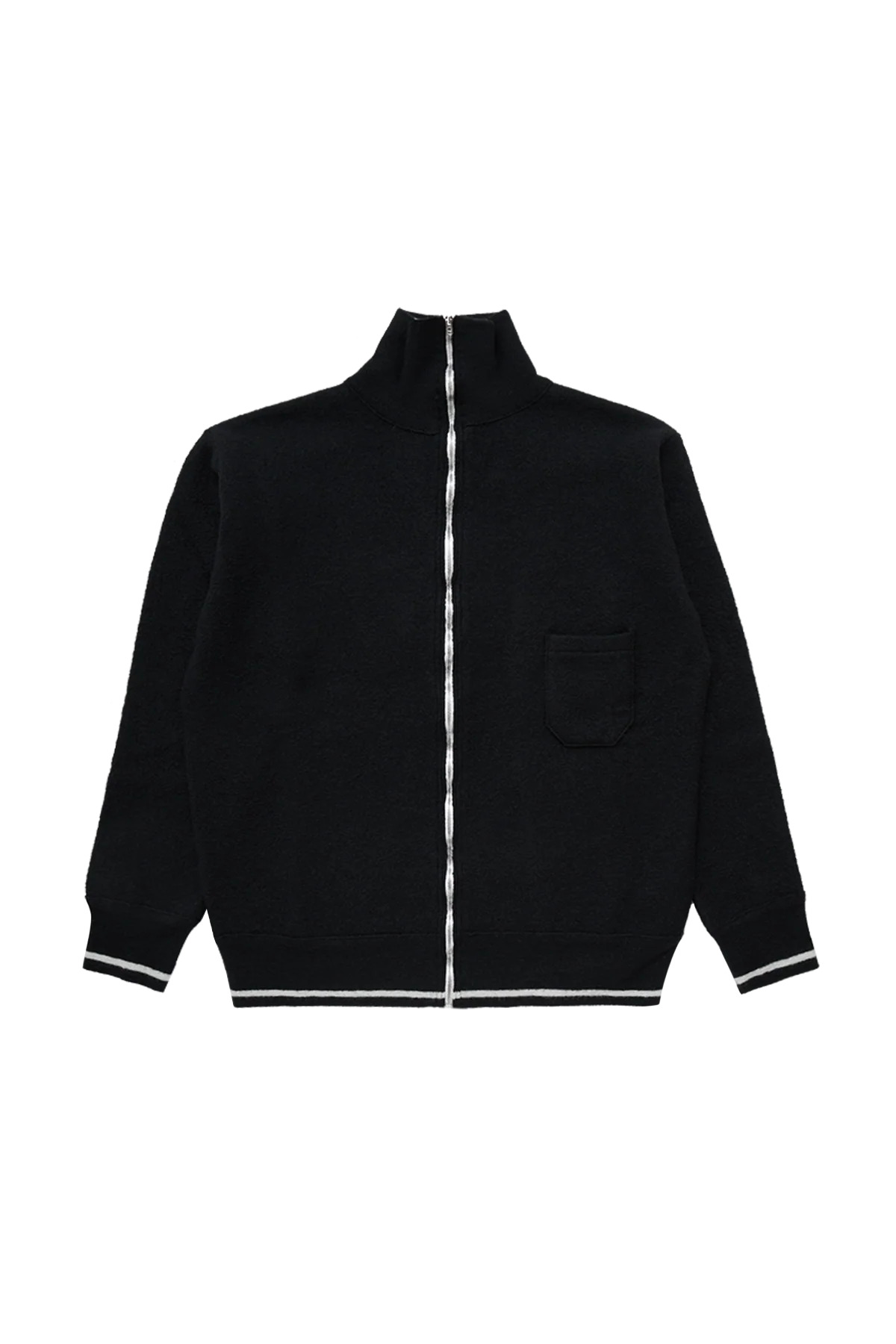 The Maison Margiela Zip Up Sweater in lightweight wool featuring a contrasting silvertone front zip creating a stand neckline that can be worn spread, off-white trim, a micro chest patch pocket, and signature four stitch logo at the back collar. Model is 6ft and wears size medium DETAILS - Lightweight knit - Silvertone front-zip - Convertible neckline - Off-white trim - Chest patch pocket - Branding stitch at back Sizing: - True to size Material: Wool Made in Italy Product codes: - SKU: ESSX/MAS/AW25/S50HP0030M13148900F/Black/S - UPC: 8059039830180
