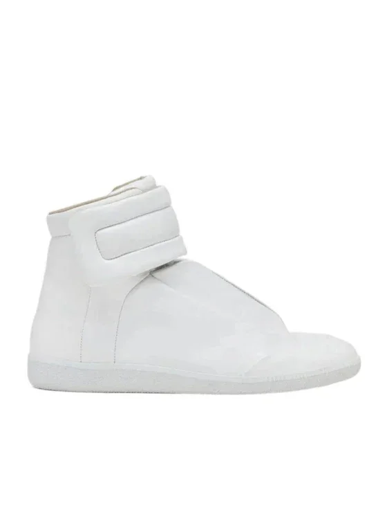 Margiela Future Mid-Top sneaker is reintroduced this season. Defined by its seamless construction and concealed fastening. Built without visible laces, a hidden strap folds across the tongue to create a uniform surface, evoking anonymity and restraint. Crafted in soft calfskin, the mid-top silhouette is finished with a tonal sole. Maison Margiela's signature single white stitch appears at the back. DETAILS Padded ankle strap sneaker Velcro closure at ankle Four stitches at the back Material: Upper: 100% calf leather Lining: 100% calf leather Inside: 100% calf leather Sole: 100% rubber Made in Italy Product codes: - SKU: ESSX/MAS/SS26/S57WS0538P7573T1003/White/40 - UPC: 8056263039846