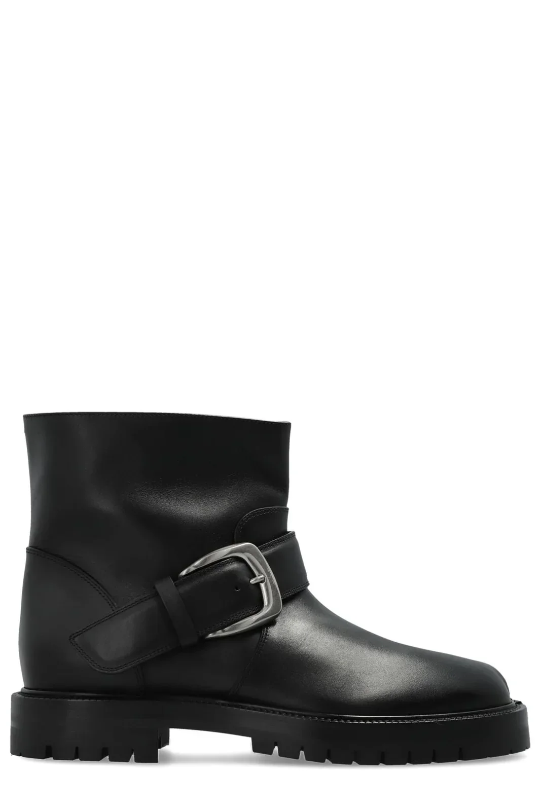 Margiela Tabi County Buckle Ankle Boots defined by Margiela's signature split toe and understated white back stitch. A silver-tone buckle strap cinches the upper, while the sturdy rubber sole and 4 cm heel deliver both polish and practicality. Refined minimalism with edge. DETAILS 100% Ovine Leather, 100% Calf Leather, 100% Rubber Made in Italy