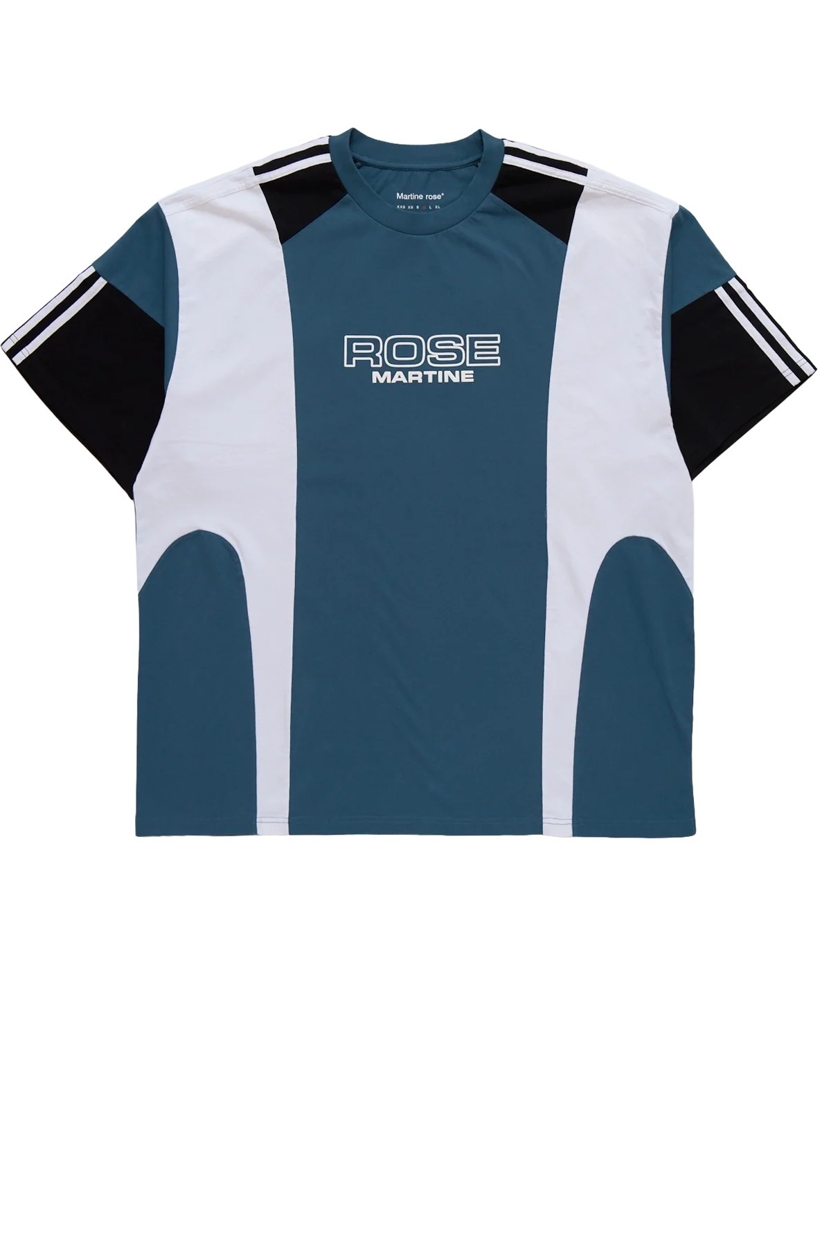 Martine Rose Oversized Panelled T-Shirt, short-sleeve crew neck tee with contrasting black and white panels, striped sleeve details, and a printed seasonal Martine Rose logo at the chest. Designed in an oversized fit. DETAILS - Oversized fit - Round neckline - Short sleeves - Printed seasonal Martine Rose logo on the chest Material: 100% Cotton Made in Portugal Product codes: - SKU: ESSX/MAR/AW25/630JE01529D/Blue/L - UPC: 5059107647996