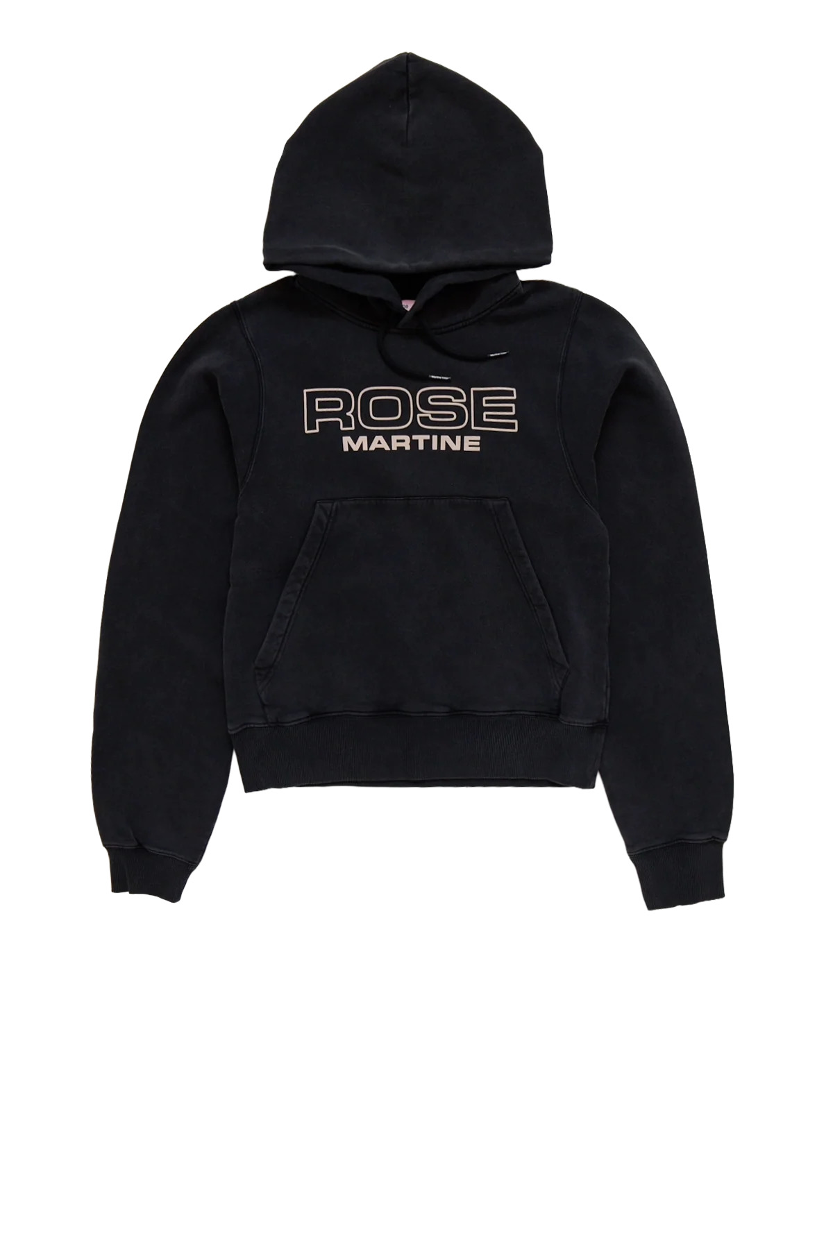 Martine Rose Shrunken Hoodie, a cotton fleece hoodie in a shrunken fit with fading throughout. Features a drawstring hood, bonded logo at the front, kangaroo pocket, and rib-knit hem and cuffs. DETAILS · Fading throughout · Drawstring at hood · Logo bonded at front · Kangaroo pocket · Rib-knit hem and cuffs Material: 100% cotton. Made in Portugal. Product codes: - SKU: ESSX/MAR/AW25/625JS01002CW/Black/L - UPC: 5059107647736