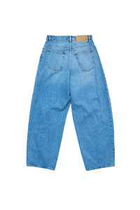 The MM6 Blue Denim With Front Seam featuring a relaxed fit with a curved leg silhouette with frayed detailing, five-pocket styling, contrasting internal drawstring, back logo patch at the waist, and logo-engraved silvertone hardware. Model is 6ft and wears size 32 DETAILS - Wide-leg - Relaxed fit - Curved leg - Frayed detailing - Five-pocket styling - Internal drawstring - Logo patch at back - Logo-engraved silvertone hardware Sizing: - True to size Material: Cotton Made in Italy Product codes: - SKU: ESSX/MM6/AW25/SH0LA0011M30018967/Blue/28 - UPC: 8059039671158