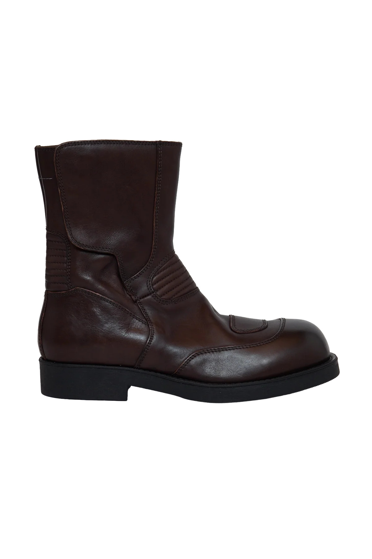 MM6 Maison Margiela Low Leather mid-calf boots reinterpret vintage moto references through a modern lens. Constructed in a brown leather-effect finish, the design features ribbed panels, curved topstitching, and a sleek silhouette that balances performance influence with everyday wearability. At the back, Margiela’s signature single white stitch adds a subtle finishing detail. DETAILS Brown leather-effect finish Ribbed panels with curved topstitching Mid-calf height Maison Margiela signature white stitch at heel Material: 100% Leather Made in Italy Product codes: - SKU: ESSX/MM6/AW25/SH3WU0015P7431T2187/Brown/42 - UPC: 8059039811479