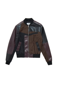 The MM6 Maison Margiela Paneled Bomber Jacket in calfskin and nylon patchwork featuring a standard fit, zip-front, ribbed knit trim, side pockets, an interior chest pocket, and signature white stitch branding at the back collar. Lined. Model is 6ft and wears size 32 DETAILS - Lightweight - Paneled bomber jacket - Patchwork construction - Standard fit - Zip-front - Rib-knit trim - Side pockets - Interior chest pocket Sizing: - True to size Material: Calf Leather + Nylon Combo Lining: Polyester Made in Italy Product codes: - SKU: ESSX/MM6/AW25/SH2AM0042M35609961/Brown/48 - UPC: 8059039863737