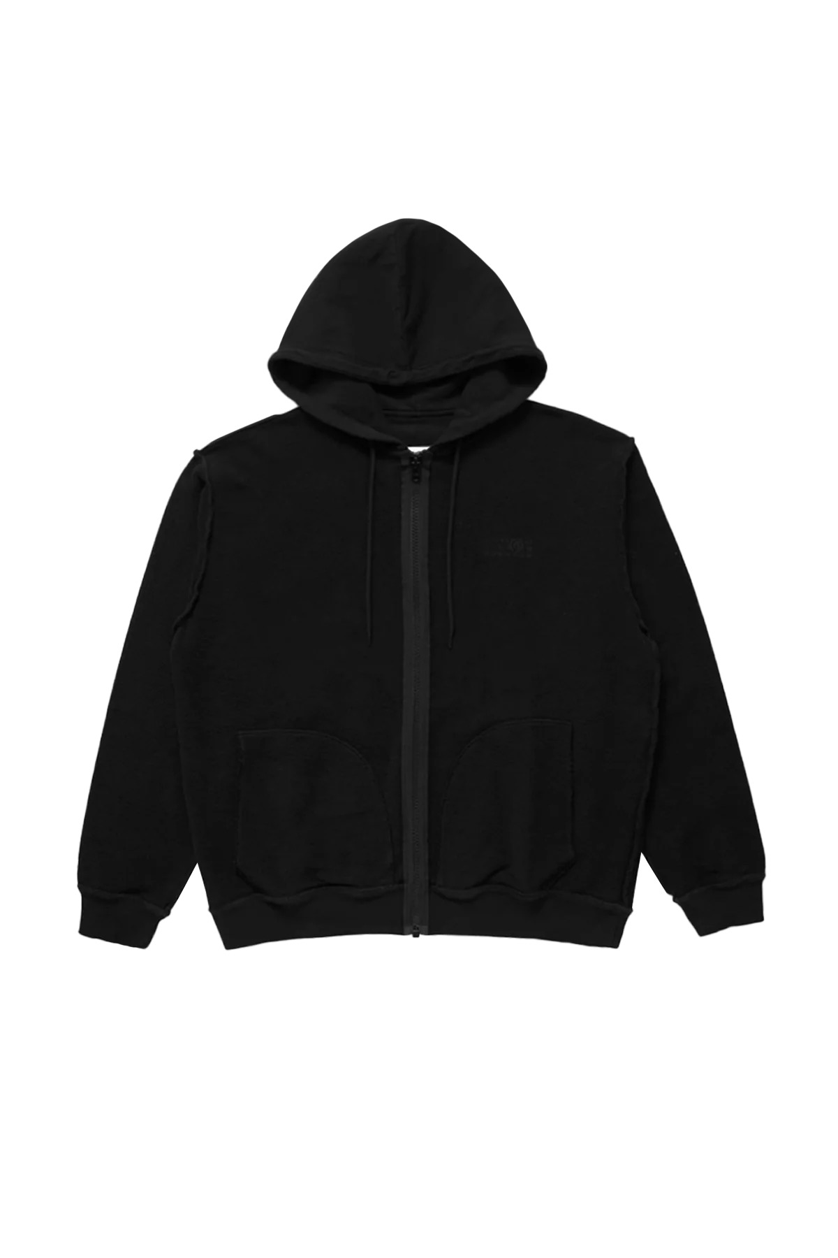 The MM6 Reversed Sweat Zip Up Hoodie featuring inverted styling in French terry creating a subtle inside-out look. It features a contrasting drawstring jersey hood, dropped shoulders, patch pockets at the front, a tonal MM6 numeric logo embroidered patch at the chest, and signature white stitch logo line at the back collar. Model is 5'10 and wears size medium DETAILS - Inverted zip-up hoodie - Contrast drawstring hood - Dropped shoulders - Patch pockets at front - Ribbed cuffs + hem - Tonal Margiela logo embroidered at chest - White stitch line at the back Material: Cotton Made in Italy Product codes: - SKU: ESSX/MM6/AW25/SH0HG0006M25014900/Black/XS - UPC: 8059039667472