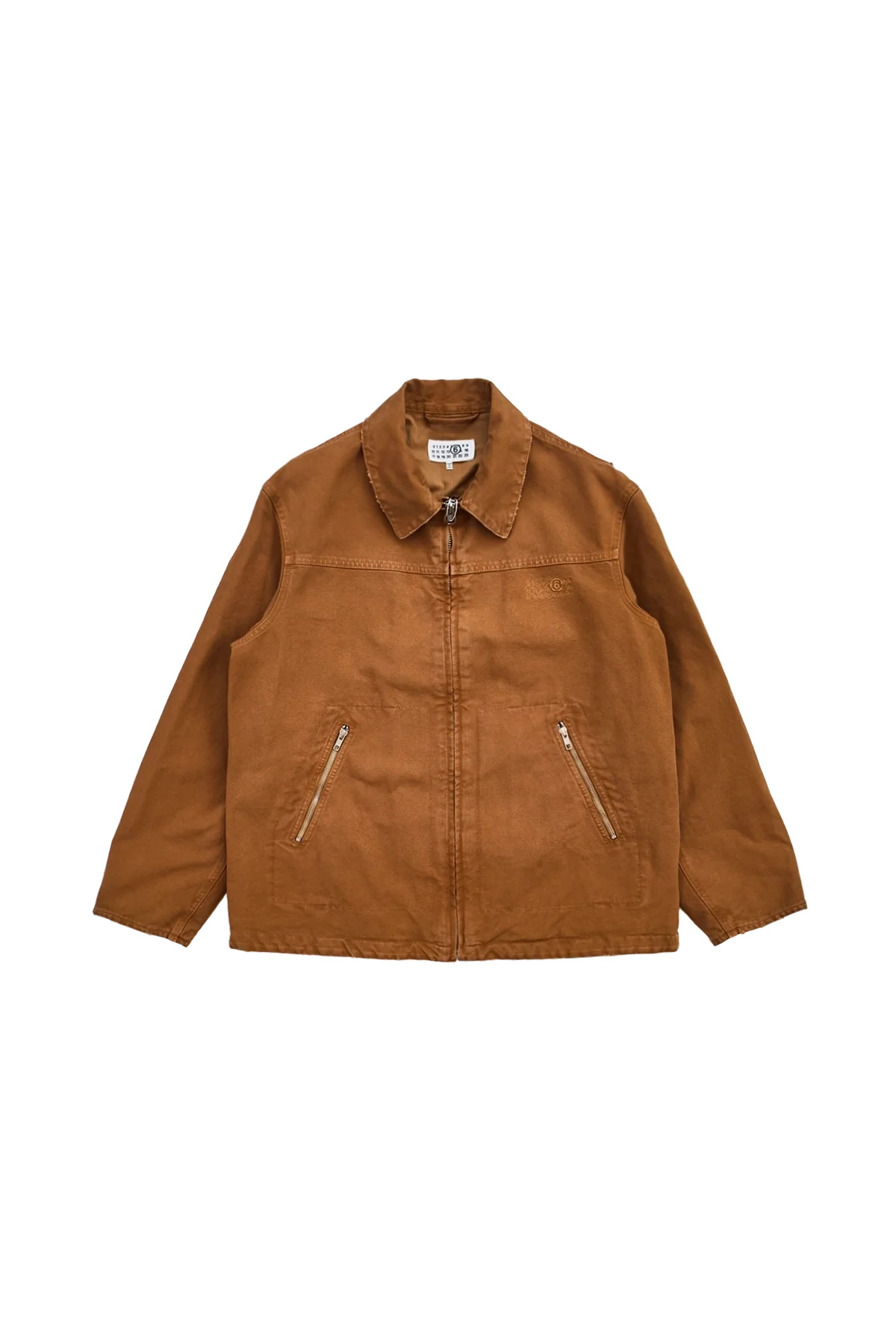 The MM6 Tan Canvas Zip-Up Jacket features subtle distressing throughout, a spread collar, pleated dropped shoulders, tonal logo embroidered at chest, zip pocket, contrast logo stitching at back neckline, and an interior patch pocket. Fully lined. DETAILS - Canvas fabrication - Subtle distressing throughout - Spread collar - Pleat at dropped shoulders - Zip closure - Tonal logo embroidered at chest - Zip pockets - Pleats at sleeves - Contrast logo stitching at back - Patch pocket at interior - Full cotton lawn cloth lining Sizing: - True to size Material: 100% Cotton Made in Italy Product codes: - SKU: ESSX/MM6/SS25/SH0AM0048M35249132/brown/46 - UPC: 8059039353542