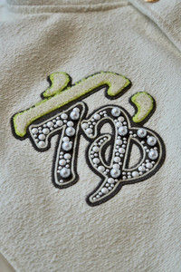 The Namesake Georgia Homecoming Varsity Jacket featuring a Mandarin collar, silicone piping, lightly padded shoulders, voluminous contrasting sleeves, graphic rib-knit trim, side pockets, embroidery at the front, and graphic faux-pearl appliques at the back. DETAILS - Lightweight - Mandarin collar - Silicone piping throughout - Padded shoulders - Textured rib knit cuffs = hem - Press stud closure - Voluminous contrast sleeve - Welt pocket with zipper closure - Embroidery at front chest - Graphic faux-pearl appliques at back Sizing: - True to size Material: 100% Wool Trim: 84% Polyester / 16% Elastane Lining: 100% Polyester Product codes: - SKU: ESSX/NMS/SS25/N3SS25JUICEJK01CC/White/S - UPC: 1403558044615