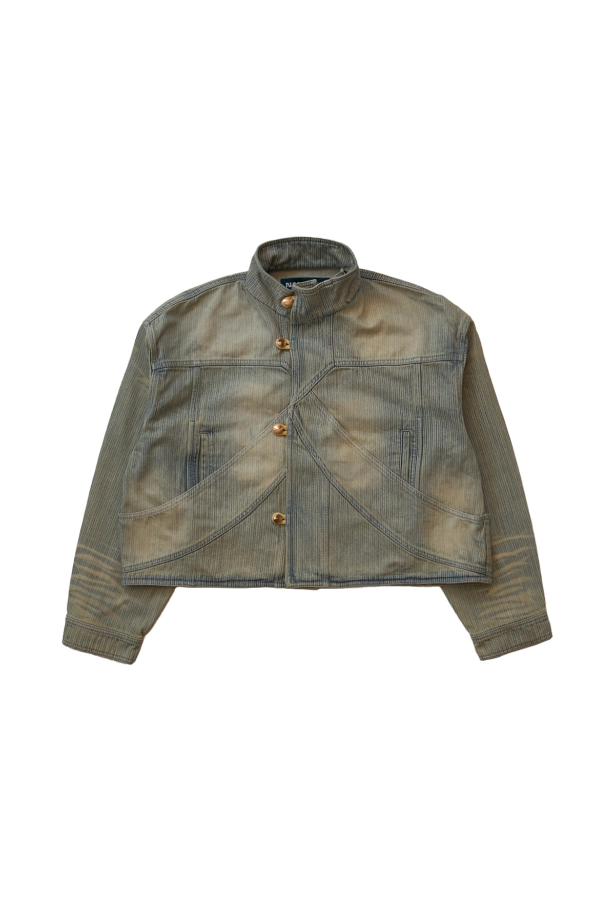 Namesake Striped Fox Denim Jacket featuring paneled construction, a faded stripe pattern, stand collar, front button-loop closure, front inset and side welt pockets, and an oversized boxy fit. DETAILS - Paneled denim construction - Fading throughout - Striped pattern - Stand collar - Front button-loop closure - Button cuffs - Front inset + side welt pockets - Straight hem - Oversized boxy fit Sizing: - True to size Material: Cotton Made in China Product codes: - SKU: ESSX/NMS/SS25/N3SS25N3JK11IS/Blue/S - UPC: 1403558044691