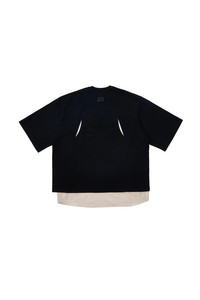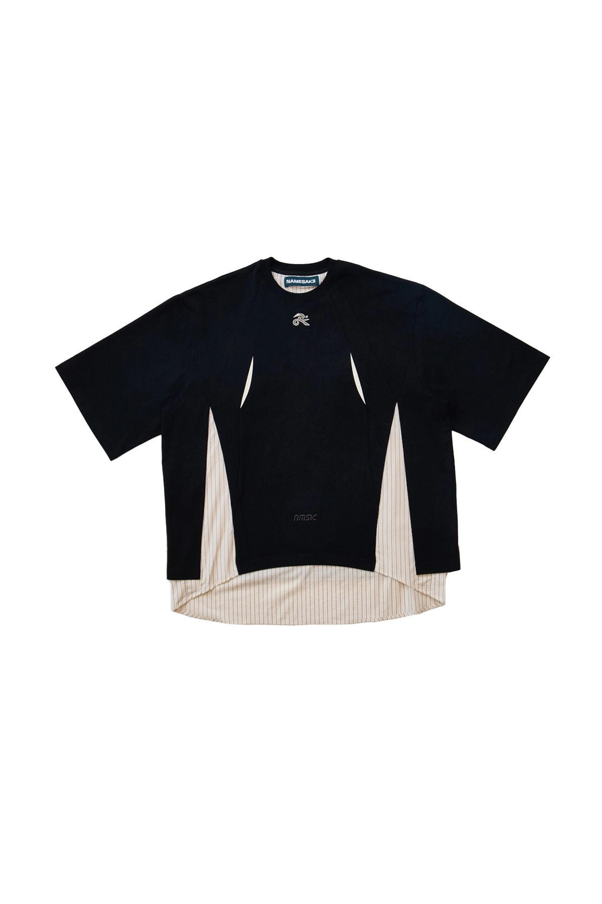 The Namesake Welsh Fusion Sports Top featuring contrasting poplin and jersey paneled construction, a crewneck, oversized boxy fit, and logo graphics at front and back. DETAILS - Lightweight - Poplin + jersey - Paneled construction - Rib-knit crewneck - Oversized boxy fit - Logo graphics at front + back Sizing: - True to size Material: Cotton Made in China Product codes: - SKU: ESSX/NMS/SS25/N3SS25N3TS04EB/Black/S - UPC: 1403558045094