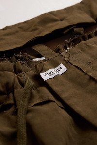 The Ottolinger Baggy Cargo Shorts in stretch broadcloth with raw edges throughout, a cut-out suspended waistband, drawstring elasticized waistband, four pocket styling, offset zip fly, logo patch at front, drawstring at the hem for alternate styling, and cargo pockets at the outseams. DETAILS - Stretch broadcloth - Raw edges throughout - Cut-out at waistband - Drawstring at elasticized waistband - Trim with button fastening at waistband - Four-pocket styling - Offset zip fly - Logo patch at front - Drawstring at hem - Cargo pocket at outseams - Logo flag at back Sizing: - True to size Product codes: - SKU: ESSX/OTT/SS25/10620040601/green/M - UPC: 4255622746218