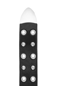 The Our Legacy Studded Double Tongue Belt in grained leather with rivets and eyelets throughout, logo plaque at buckle, and allover silver-tone hardware. W1.5" DETAILS - Grained leather - Studded double tongue styling - Rivets + eyelets at length - Logo plaque at keeper loop - Pin-buckle fastening - Silver-tone hardware - W1.5" Sizing: - True to size Material: Leather Made in Portugal Product codes: - SKU: ESSX/OUR/SS25/A2258DFL/black/70 - UPC: 7300000511449