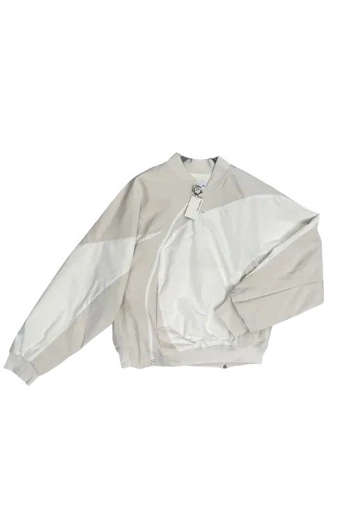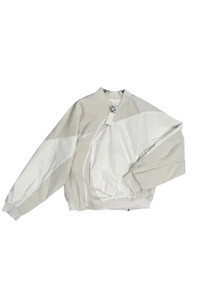 POST ARCHIVE FACTION (PAF) 6.0 Bomber Jacket Center In White with water-resistant twill and taffeta fabrication, paneled and asymmetric construction, dolman sleeves, darts at elbows, stand collar, two-way front zip, zip pockets, and concealed zip vent at back hem. Fully lined. This item is final sale and is not eligible for return or exchange. DETAILS - Twill + taffeta bomber jacket - Water-resistant - Paneled + asymmetric construction - Dolman sleeves - Darts at elbows - Rib-knit stand collar, hem + cuffs - Two-way YKK® VISLON® zip closure - Zip pockets - Concealed zip vent at back hem - Full nylon poplin lining Sizing: - True to size Material: 100% Polyester Lining: 100% Polyamide Made in South Korea Product codes: - SKU: ESSX/PA1/60OBCIV/WHT/L - UPC: 2100001973766