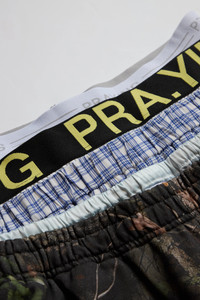 The Praying Real Tree Underwear Sweatpants in camoflauge are layered pull-on pants featuring multiple boxer-short inspired waistbands with logo print, an elasticated waist, side pockets, and single back patch pocket. DETAILS - Layered styling - Pull-on pants - Logo at waist - Side pockets - Elasticated waistband - Back patch pocket Material: Cotton Made in China Product codes: - SKU: ESSX/PRA/AW25/PRAY240853/Green/XS - UPC: 1403558052009
