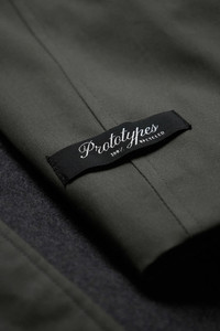 Prototypes hybrid cape-style trench coat in upcycled textiles featuring gabardine outer layer with a wool-blend jacket-style under layer, spread collar, welt pockets, logo patch at cuff, and hidden front closure. It's two-in-one combination allows for a myriad of styling options. Fully lined. DETAILS - Upcycled Fabrication - Layered Gabardine Cape-Style Trench Coat - Wool-Blend Melton Jacket-Style Underlay - Spread Collar - Concealed Button Closure - Welt Pockets - Logo Patch at Cuff - Full Satin Lining Sizing: - True to size Material: 65% Polyester 35% Cotton Body 2: 50% Wool 50% Cotton Lining: 100% Polyester Made in Italy Product codes: - SKU: ESSX/PT06TOW04US/Grey/OS - UPC: 1403558017718