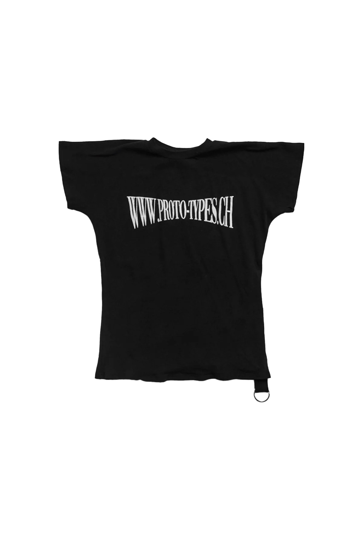 The Prototypes Website Tee in jersey with a slim-fit, crewneck, contrast logo graphic printed at the front, cropped hem with an integrated strap with keyring, and signature logo flag at back collar. DETAILS *Size M is S/M, XL is L/XL - Upcycled jersey fabrication - Crewneck - Logo graphic printed at front - Cropped hem - Integrated strap with keyring at hem - Logo flag at back collar - Each item is unique + may vary Material: Upcycled Cotton Made in Italy Product codes: - SKU: ESSX/PRO/SS25/PT07TO04USB/Black/L-XL - UPC: 1000000015362