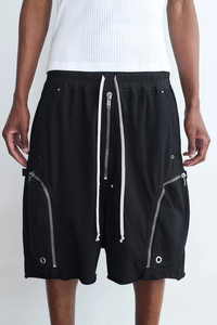 The Rick Owens Drkshdw Bauhaus Bela Shorts in stretch organic cotton poplin featuring a drawstring at the elasticized waistband, four-pocket styling, graphic exposed zip fly, eyelets, rivets, and studs at the front, a dropped inseam, and zip pockets at the outseams. DETAILS - Stretch poplin shorts - Drawstring at elasticized waistband - Four-pocket styling - Exposed zip fly - Eyelets, rivets + studs at front - Dropped inseam - Zip pocket + leather tags at outseams Sizing: - True to size Material: 97% Organic Cotton / 3% Elastane Made in Italy Product codes: - SKU: ESSX/ROD/AW25/DU02E7389RIG/Black/S - UPC: 8052217943634
