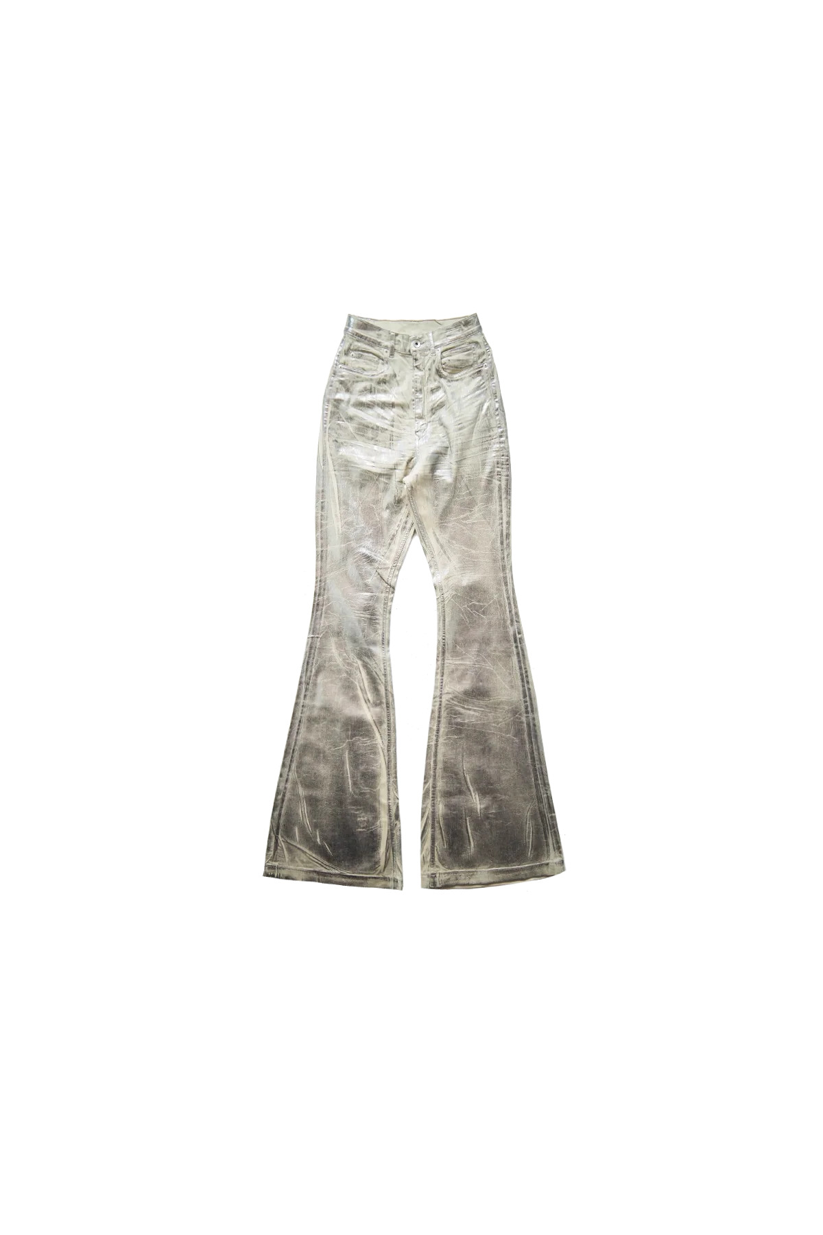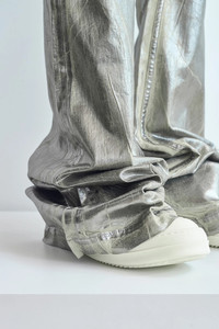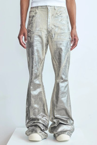 The Rick Owens Drkshdw Bolan Bootcut Jeans in lightweight stretch denim featuring an overdyed palladium foil overlay washed to achieve an irregular look with a high-waist, floor-length elongated leg, zip and button fly, five-pocket styling, and creasked whiskering at the crotch. DETAILS - Lightweight stretch denim - Palladium foil overlay - High-waist - Floor-length elongated leg - Zip + button fly - Five-pocket styling - Creasked whiskering at crotch Sizing: - True to size Material: 90% Cotton / 7% Polyester / 3% Rubber Made in Italy Product codes: - SKU: ESSX/ROD/AW25/DS02E7311SDPF/Silver/26 - UPC: 8052217950250