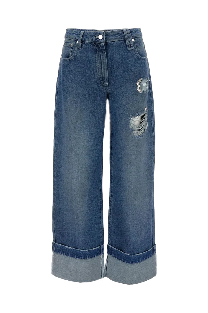 Simone Rocha Distressed Straight Leg Jeans features embellishments by the rips at the front. The model is wearing this style with the Turbo Embellished Sculpted Belt Detail Jacket. Due to the nature of the wash and finishing each piece is unique, no two are exactly alike. DETAILS Signature embellishment Beaded label at back Four pocket styling Cuffed turn up hem Mid-waist fit Material: 100% Cotton Made in Portugal Product codes: - SKU: ESSX/SIM/AW25/4161B1231D/Blue/L - UPC: 5391548049046