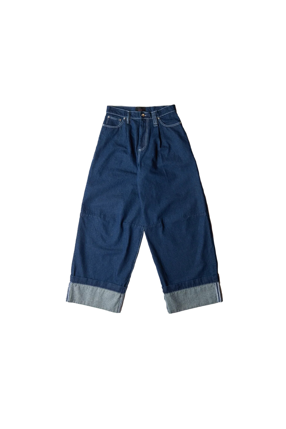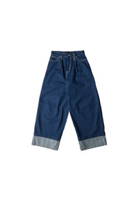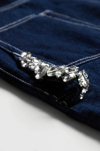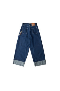The Simone Rocha Wide Leg Puddle Denim Jeans with a relaxed-fit, pleated front, rolled cuffs, a crystal embellished logo patch at the back waistband, and crystal covered hammer loop. DETAILS - Non-stretch denim - Relaxed-fit - Wide-leg - Five-pocket styling - Pleats at front - Zip fly - Belt loops - Rolled cuffs - Crystal logo patch at back waistband - Crystals at hammer loop - Contrast stitching in white Sizing: - True to size Material: Cotton Made in Portugal Product codes: - SKU: ESSX/SIM/SS25/4131B1231/Blue/S - UPC: 5391547911030