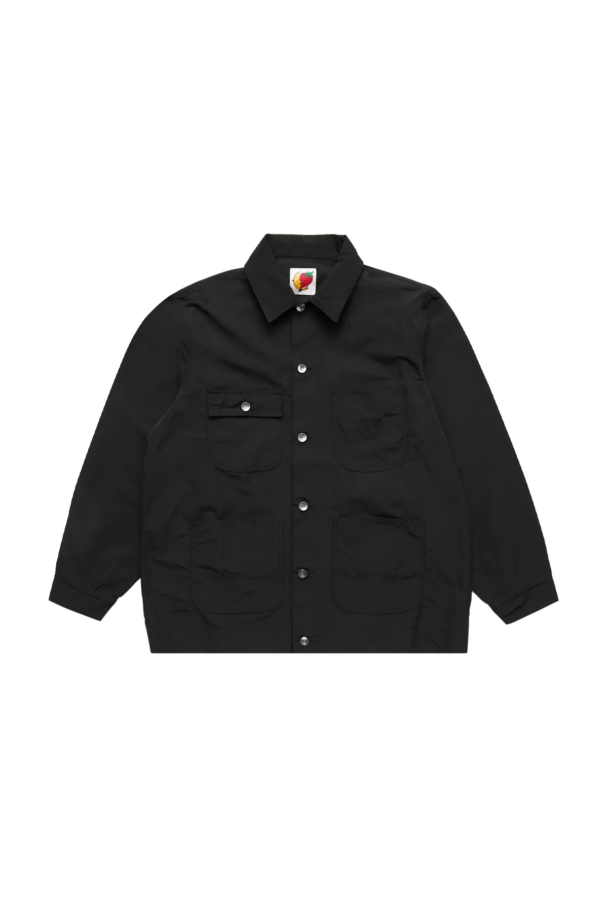 The Sky High Farm Nylon Chore Coat in lightweight canvas featuring four pockets at the front, tonal logo embroidery at the chest, and buttoned cuffs. DETAILS - Lightweight canvas - Spread collar - Front pockets - Logo at chest - Buttoned cuffs - Unlined Sizing: - True to size Material: 57% Cotton / 43% Recycled Polyamide Made in Portugal Product codes: - SKU: ESSX/SHF/SS25/SHF07C002/Black/L - UPC: 3607936203139