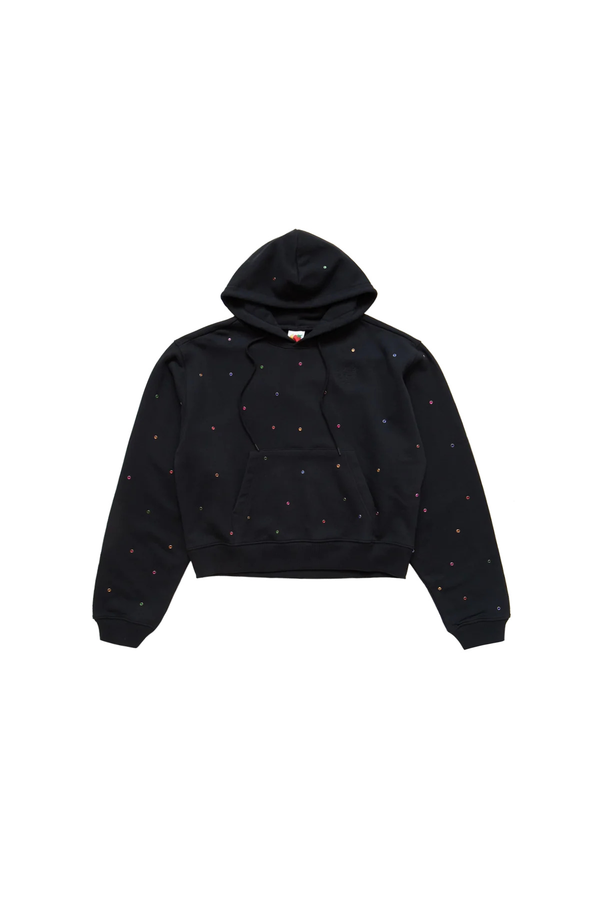 The Sky High Farm Studded Hoodie featuring dropped shoulders, a kangaroo pocket, and colorful crystal studs throughout. DETAILS - Pullover styling - Dropped shoulders - Kangaroo pocket - Drawstring hood - Studded detail throughout - Terrycloth lining Sizing: - True to size Material: Cotton Made in Portugal Product codes: - SKU: ESSX/SHF/SS25/SHF07T041/Black/XS - UPC: 3607936209131