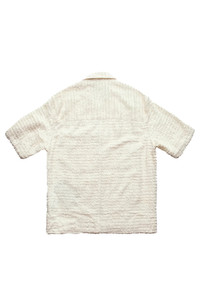 The Song For The Mute Zip Up Box Shirt in White is an oversized top with a textured fabrication, tonal stripes, two-way zip-front, vented side seams, and chest patch pocket. This item is final sale and is not eligible for return or exchange. DETAILS - Textured Fabrication - Tonal stripes - Two-way zip-front - Short sleeve - Vented side seams - Patch pocket at chest Material: 52% Polyester / 48% Rayon Made in Australia Product codes: - SKU: ESSX/242MSH067SHSTWHT/WHITE/46 - UPC: 1403558012850